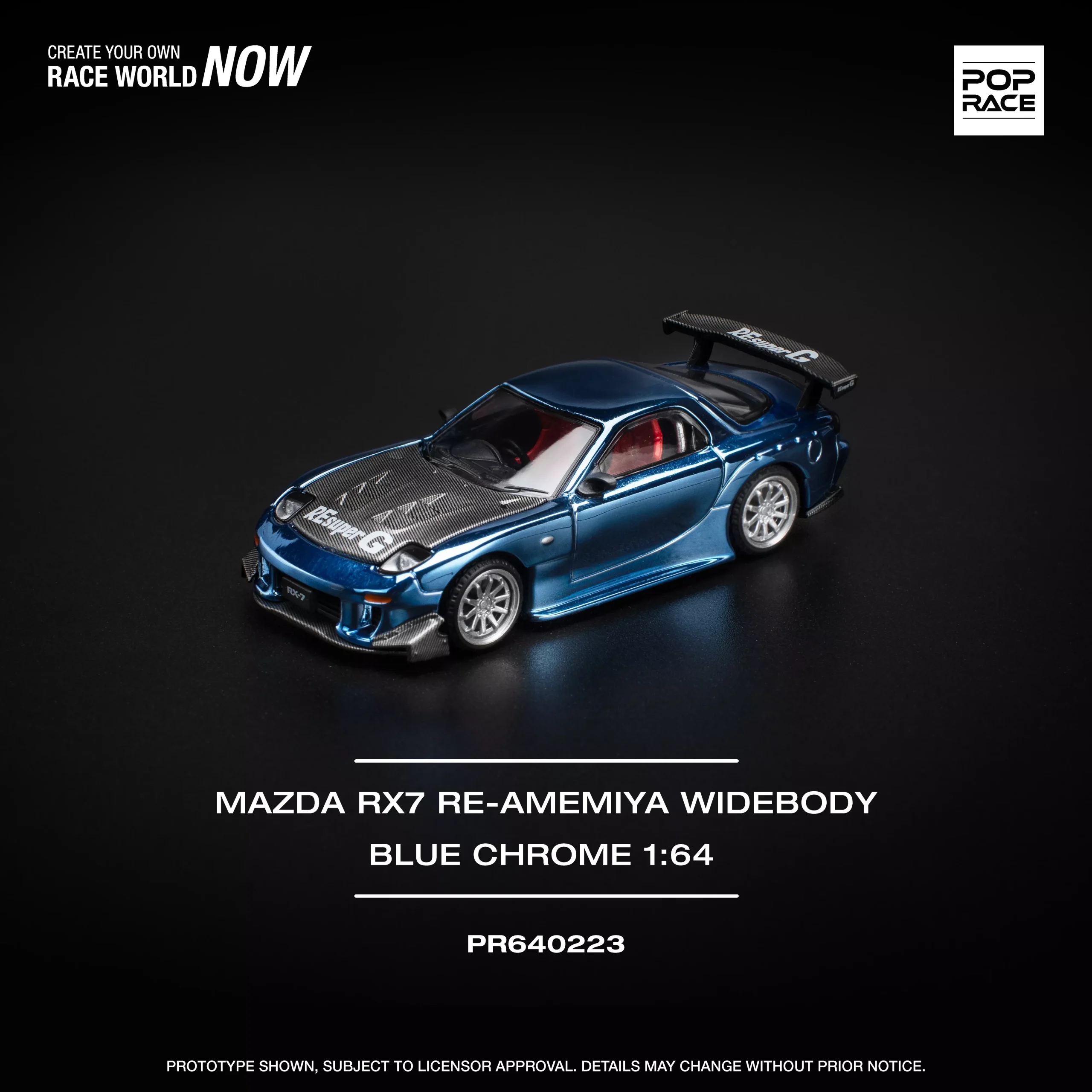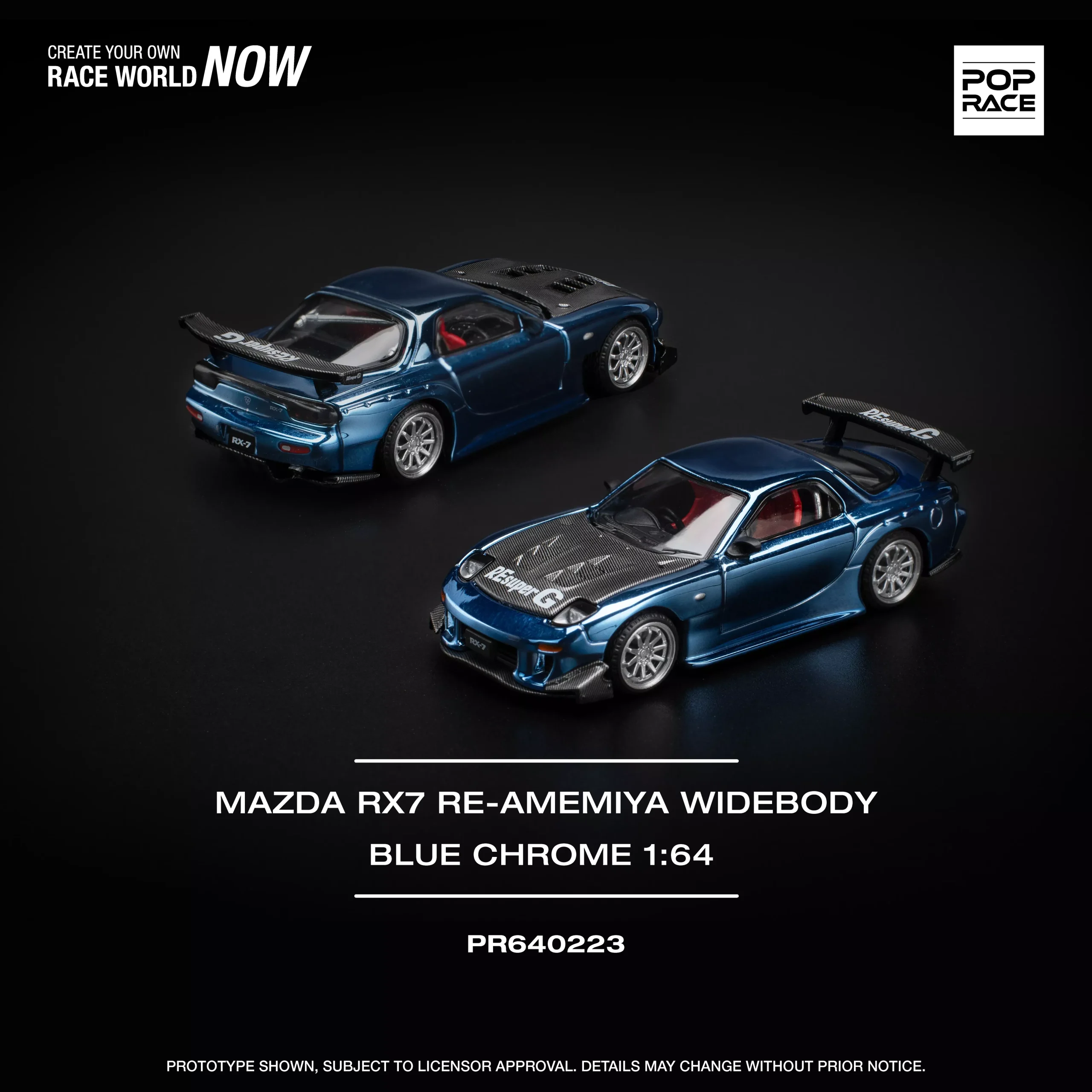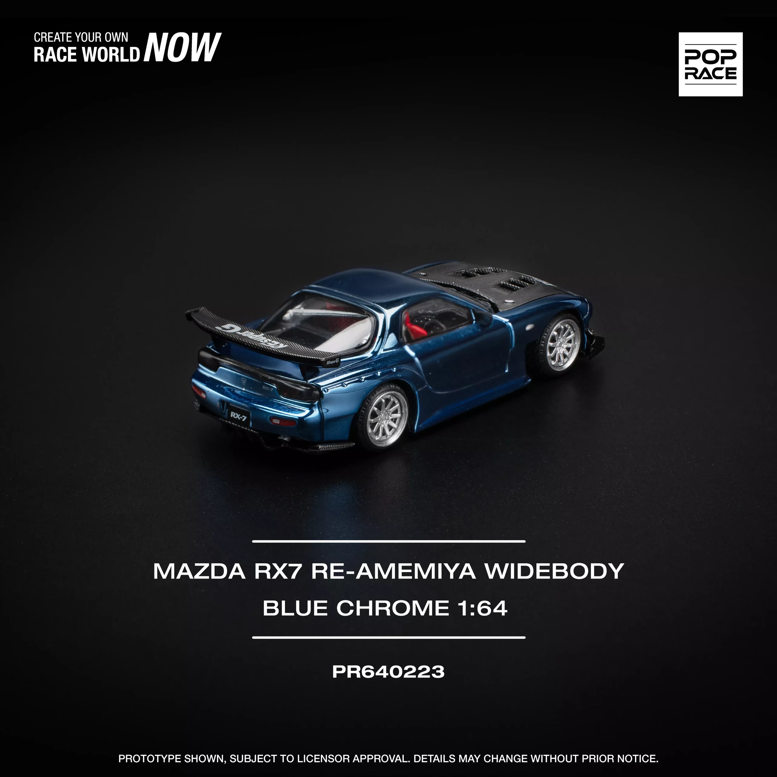 Pop Race 1:64 Mazda RX-7 RE-Amemiya Widebody in stunning chrome blue finish (PR640223). Highly detailed diecast model featuring aggressive widebody styling, premium paint, and collector-grade quality. Perfect for JDM collectors and 1:64 scale enthusiasts.